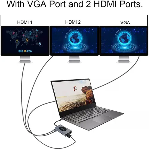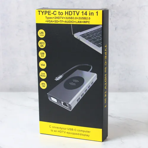 Adapter Type C na LAN Gb, Wireless PC, SD card, TF, Type C, 3xUSB 3.0, 2xUSB 2.0, Audio, 2xHDMI i VGA 14 u 1 20cm kabl