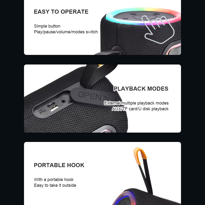 Podrška za povezivanje: BT, USB, TF kartica, AUX, FM radio, TWS povezivanje