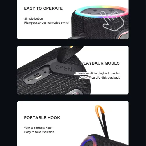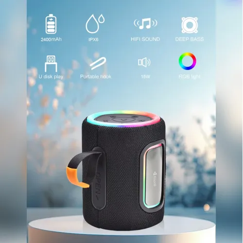 Kisonli Q34 Bluetooth 5.3 zvučnik snage 15W sa 2400 mAh baterijom, RGB osvetljenjem i BT/USB/TF/AUX/FM/TWS funkcijama – idealan za kuću, kancelariju i putovanja.