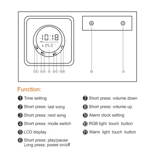 Funkcije: LED treptajuće svetlo, šareno LED svetlo, sat, alarm, toplo LED noćno svetlo