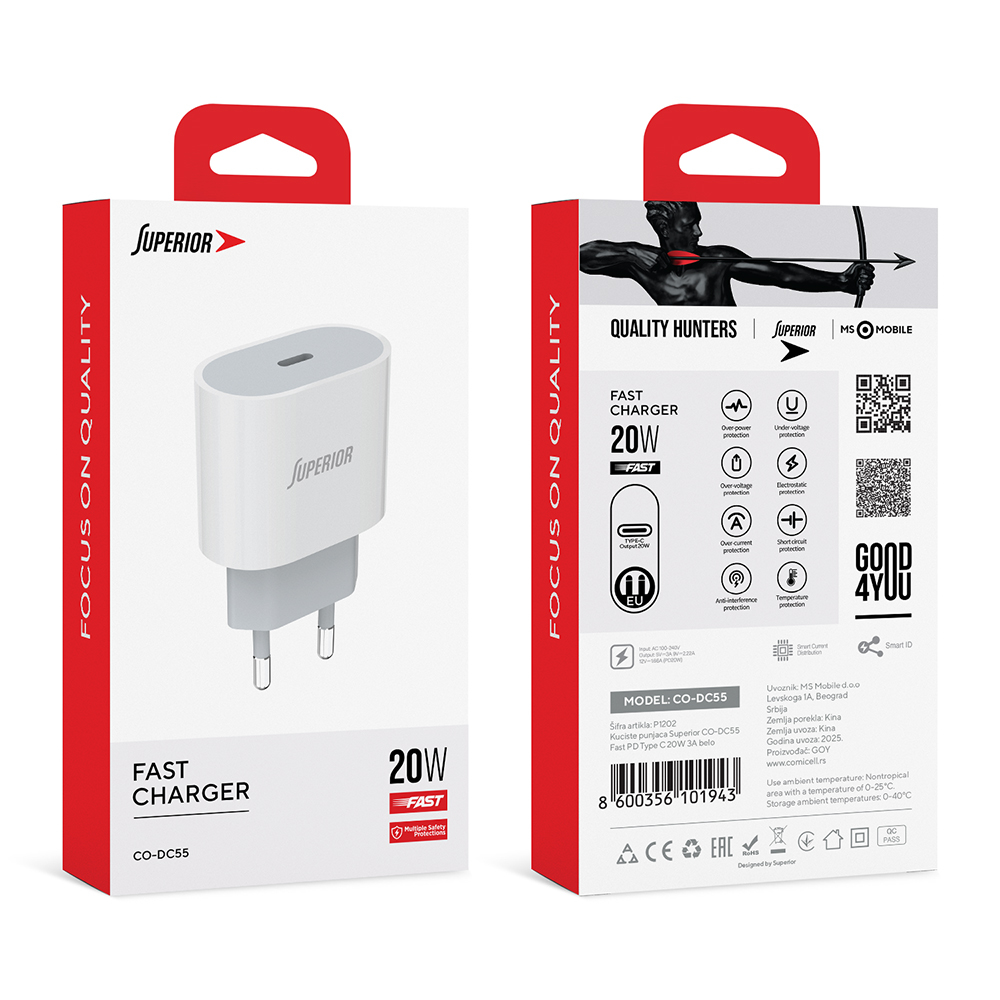 Podržava standarde brzog punjenja PD-20W, PPS, QC3.0/QC2.0 fast charging, Huawei fast charge FCP, Samsung fast charge AFC i dr. Punjač je pogodan za punjenje iPhone/Apple uredjaja do 20W