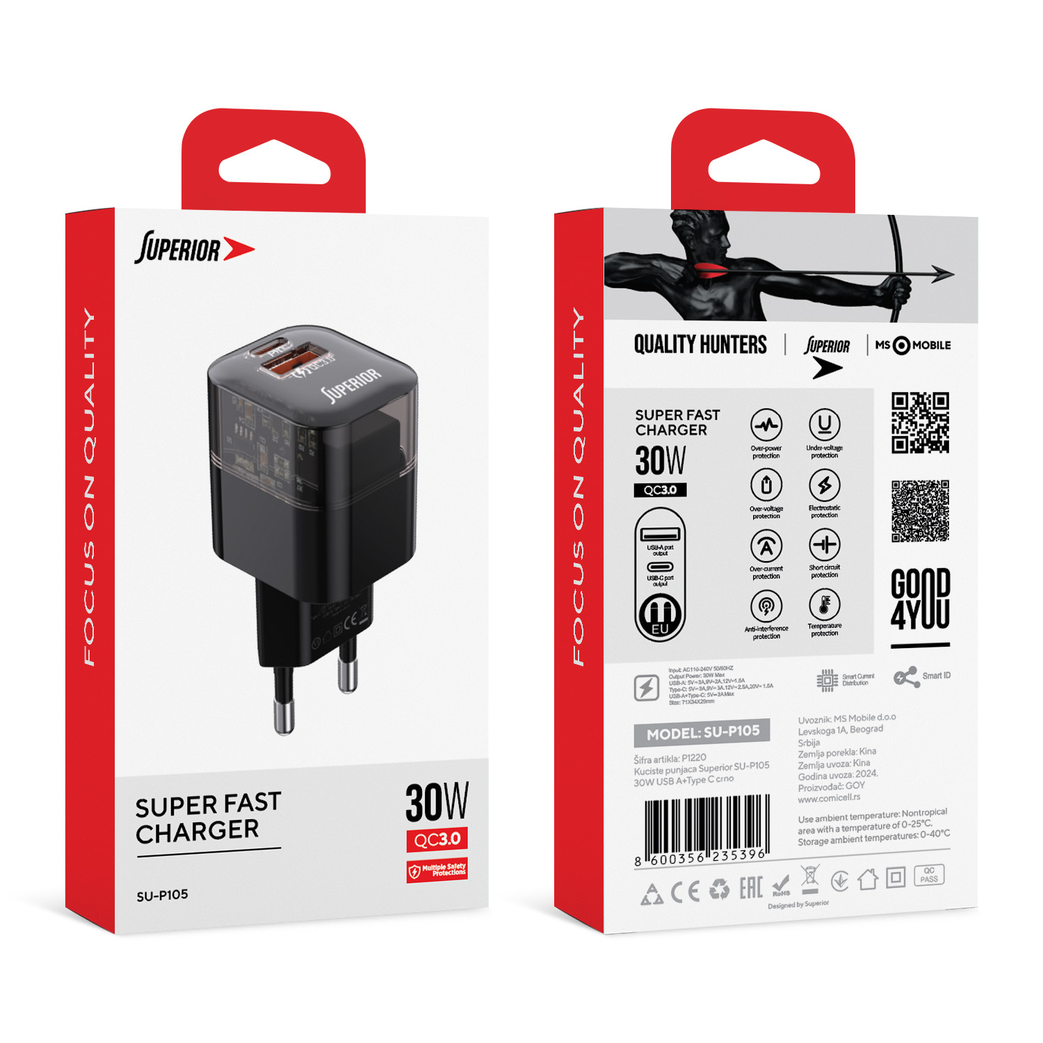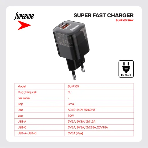 Kuciste punjaca Superior SU-P105 30W Super Fast USB A QC3.0+Type C crno (MS)