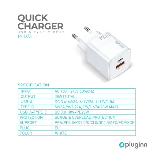 Kucni punjac Pluginn PI-D73, QC3.0 PD3.0, PPS, USB-PD 18W+20W, 38W (total) beli CE