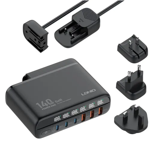 Kucni punjac sa adapterima LDNIO A6140C GaN PPS 3xQC3.0 (30W), 3xPD3.0 (100W), 140W Max, a Type C na Type C kablom crni