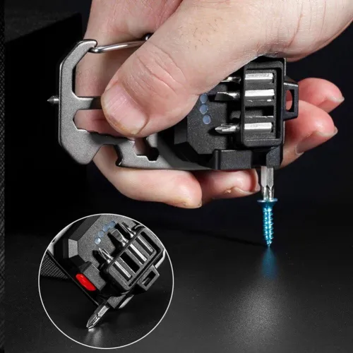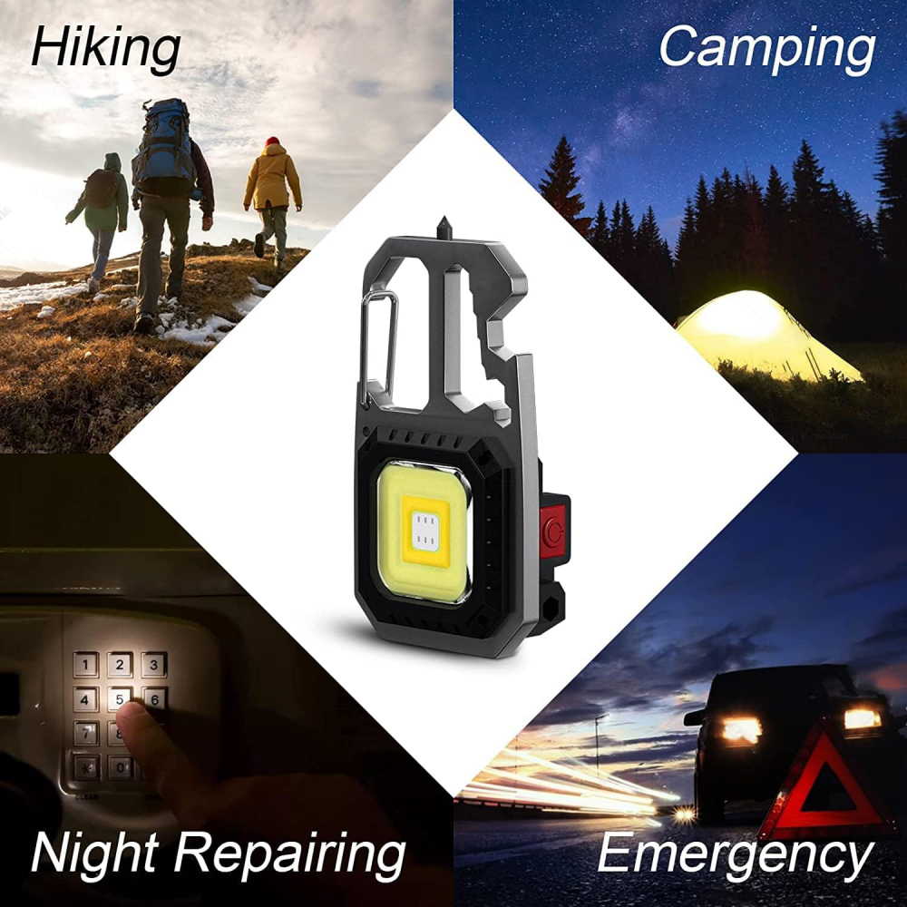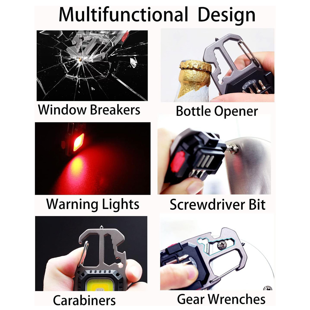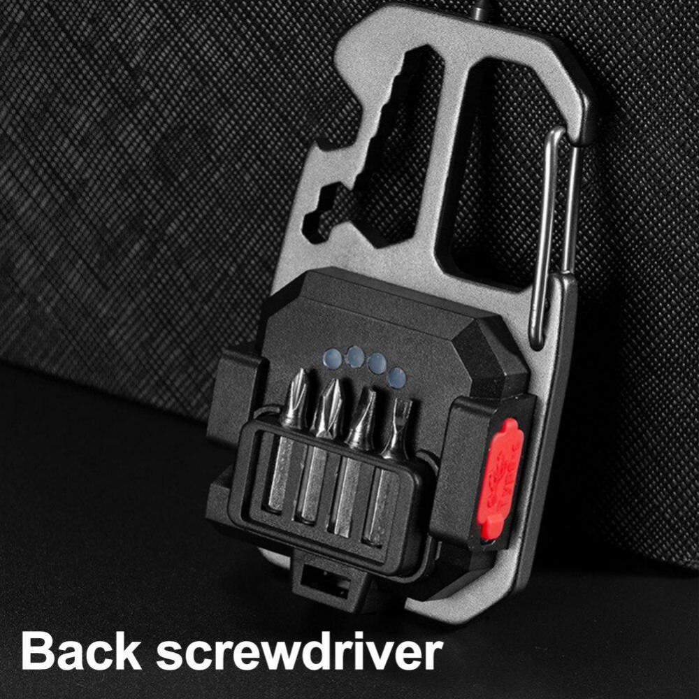 LED lampa privezak, otvarac za flase, univerzalni kljuc sa razbijacem stakla i srafcigerima, crna