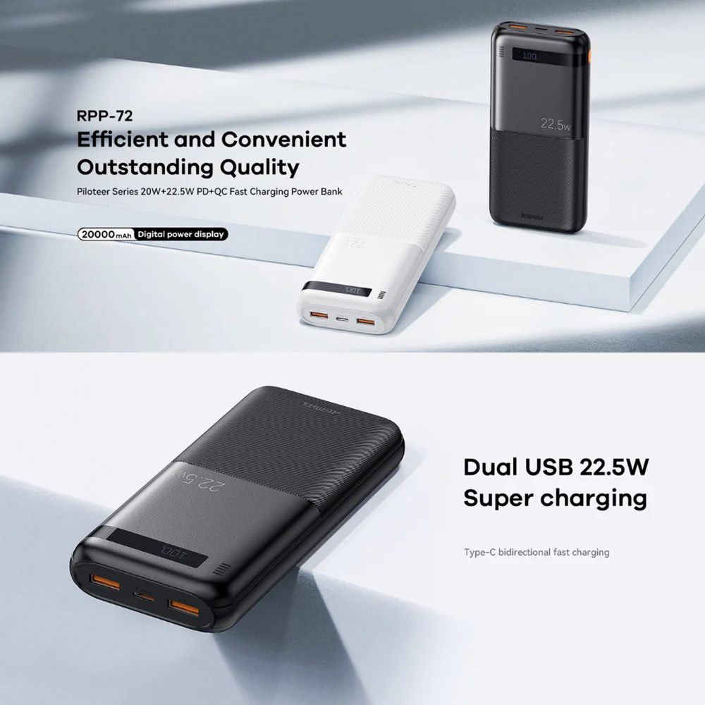 Power Bank prenosiva baterija Remax Piloteer 20W PD+22.5W QC 20000mAh RPP-72 crni (MS)