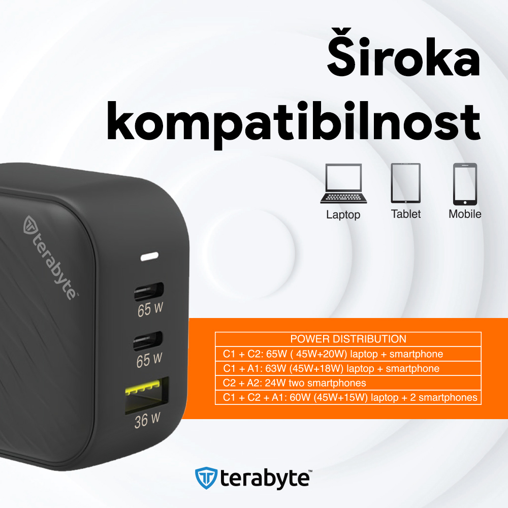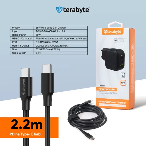 Punjac univerzalni Terabyte TR65W, GaN, PPS, PD 3.0, QC 3.0, 65W sa PD Type c kablom crni CE