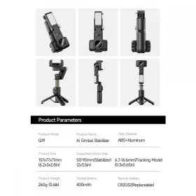 Tripod stabilizator Q19 smart AI sa selfie stickom i LED svetlom crni