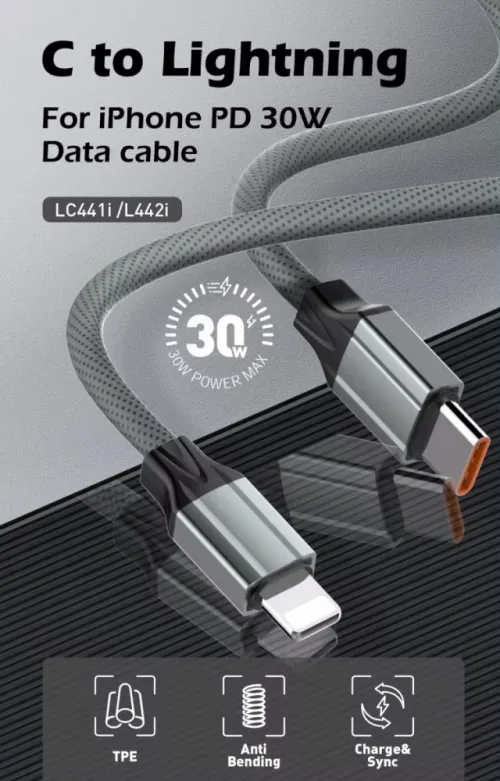 USB Data kabl LDNIO LC441I 30w, Type C na iPhone lightning sivi 1m