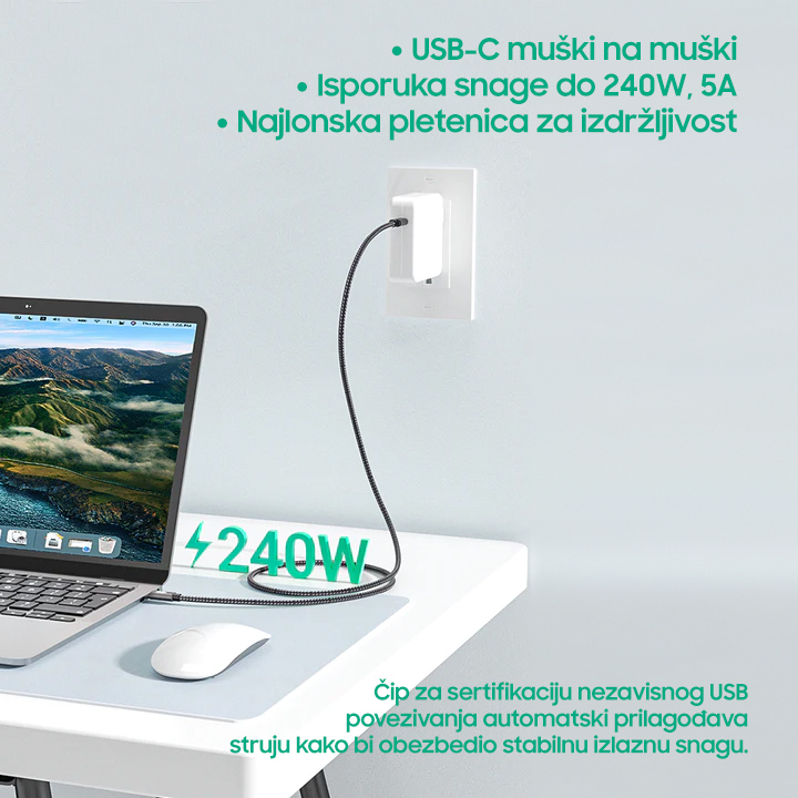 USB Data kabl Thunderbolt PD na Type C 40Gbps 240W 5K sivi 1m